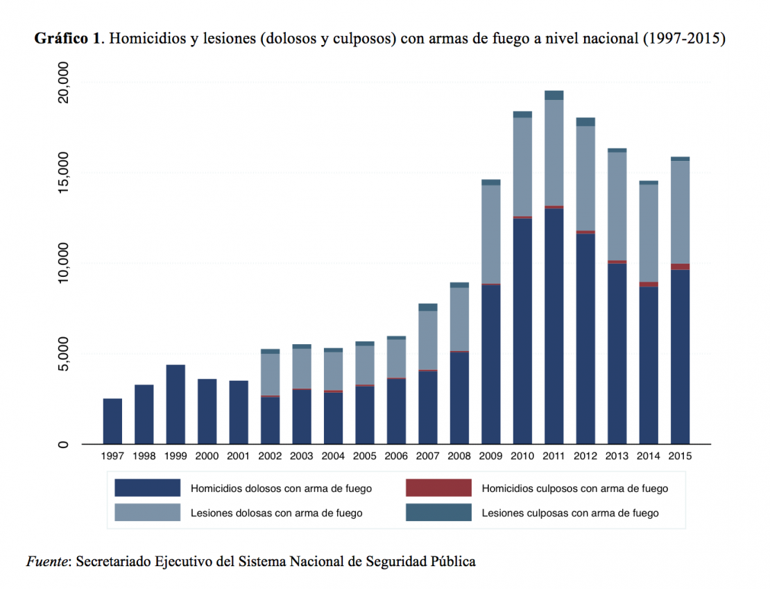 Para dimensionar lo anterior, tan sólo en el año pasado se registraron, en promedio, alrededor de 43 víctimas diarias por arma de fuego en México.Asimismo, como se puede apreciar a nivel nacional, no sólo los homicidios dolosos cometidos con balas han crecido, sino también las lesiones dolosas.A diferencia de los primeros, estas últimas se han mantenido relativamente constantes desde el año 2009, aunque muestran un alza importante en el 2015.
