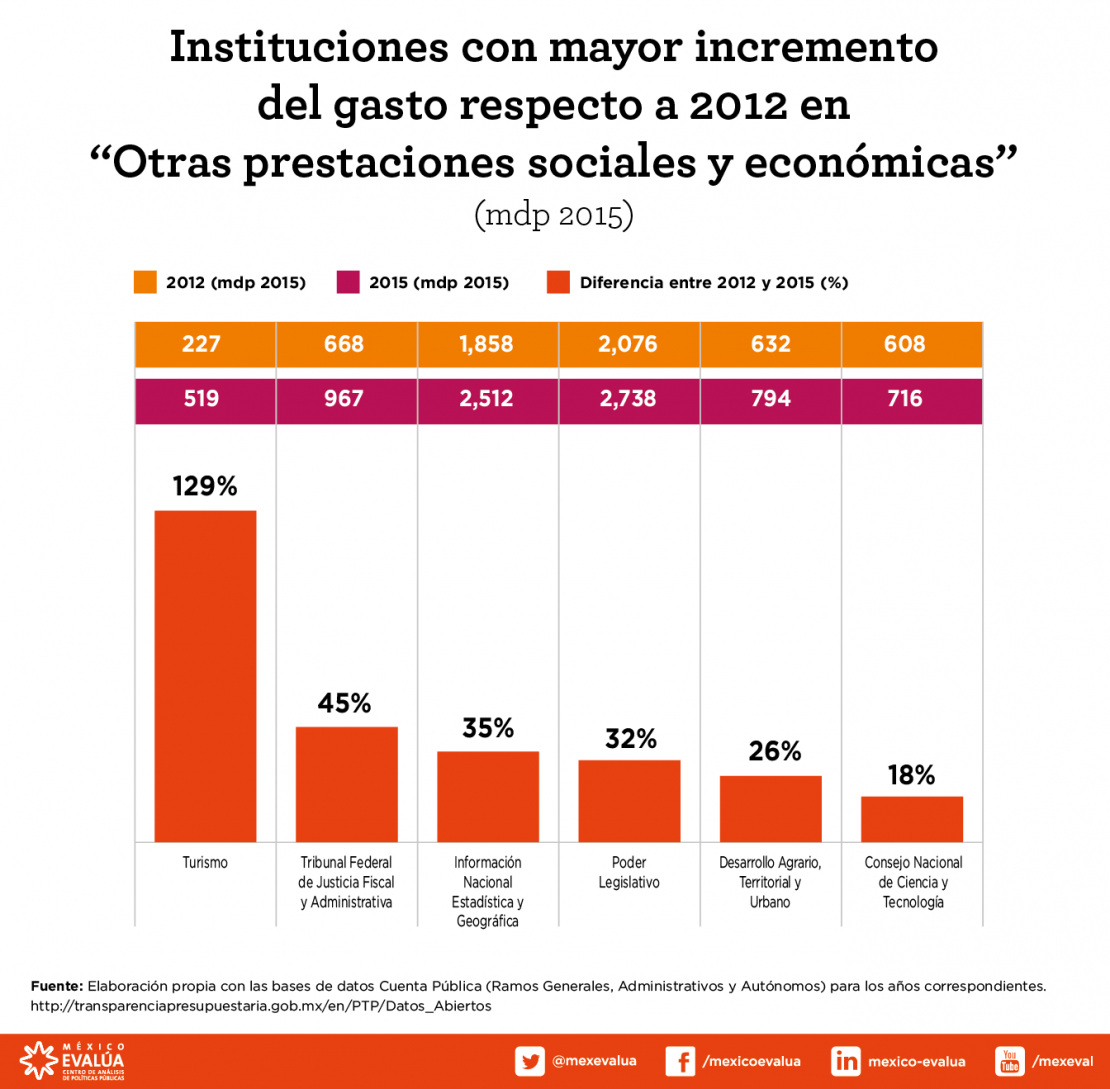 Finalmente el gasto en “Otras prestaciones sociales y económicas”, que incluye indemnizaciones, asignaciones adicionales al sueldo y prestaciones contractuales como vales de despensa, gastos para eventos y ayuda para renta, por mencionar algunos, aumentó 8 por ciento en términos reales, o 6 mil 050 mdp[2], equivalentes al 93 por ciento del recorte que se notificó en junio al Seguro Popular (6 mil 500 mdp).