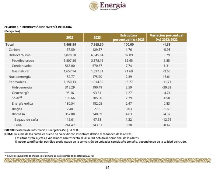 La leña y el bagazo de caña aportaron, en 2023, el 33.58% de la energía producida bajo la clasificación “energía renovable”, según las estadísticas de la Secretaría de Energía (Sener) en su publicación anual Balance de Energía (ver imagen). En contraste, por ejemplo, la energía solar representó el 20%, la eólica 17% y la geotermia 9.2%. Esto significa que, juntas, la leña y el bagazo (bajo la categoría “biomasa”) representan la proporción más importante del total de la energía clasificada como renovable.