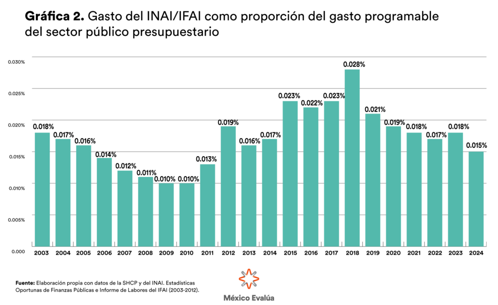 La iniciativa presentó el presupuesto de cada ejercicio fiscal de 2018 a 2024 para exponer “el alto costo” de estos organismos y con ello justificar la necesidad de evitar la duplicidad de funciones y permitir ahorros presupuestales. Apuntamos aquí que el gasto del INAI nunca ha representado más del 0.03% del gasto programable del sector público, y en 2024 registró el porcentaje más bajo desde 2011.