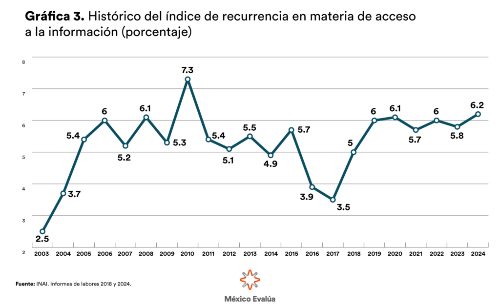 Otro problema, que deriva en más impugnaciones ante el INAI, es que cada vez más los solicitantes de información acuden más a este organismo por estar inconformes con las respuestas que les dieron los sujetos obligados. De hecho, respecto al total de solicitudes ingresadas en materia de acceso a la información, en 2024 se alcanzó el porcentaje más alto de recursos interpuestos ante el INAI desde 2010.