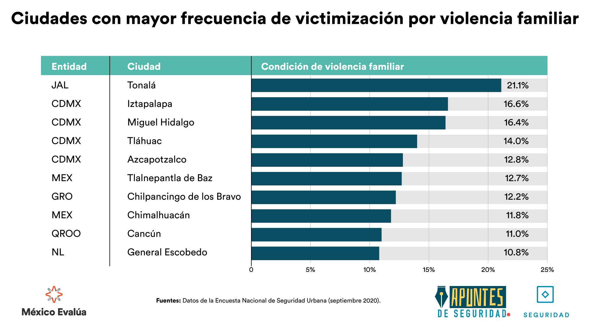 Gracias a los datos de la ENSU podemos saber que las dinámicas en los hogares varían de ciudad a ciudad. Las cinco ciudades y alcaldías más violentas en el entorno familiar son: Tonalá (Jalisco), con el 21.1%, Iztapalapa, con el 16.6%; Tláhuac, con el 14.0%, Miguel Hidalgo con el 16.4% —estas tres últimas pertenecientes a la CDMX— y, finalmente, Tlalnepantla (Estado de México), con un 12.7%. Por el contrario, las ciudades con menores casos de violencia son: San Pedro Garza García (Nuevo León), con apenas 2.1%; Tampico (Tamaulipas), con 2.2%; Tepic (Nayarit), con 3.0%; Saltillo (Coahuila) con 3.0%, y Reynosa (Tamaulipas), con 3.5%.