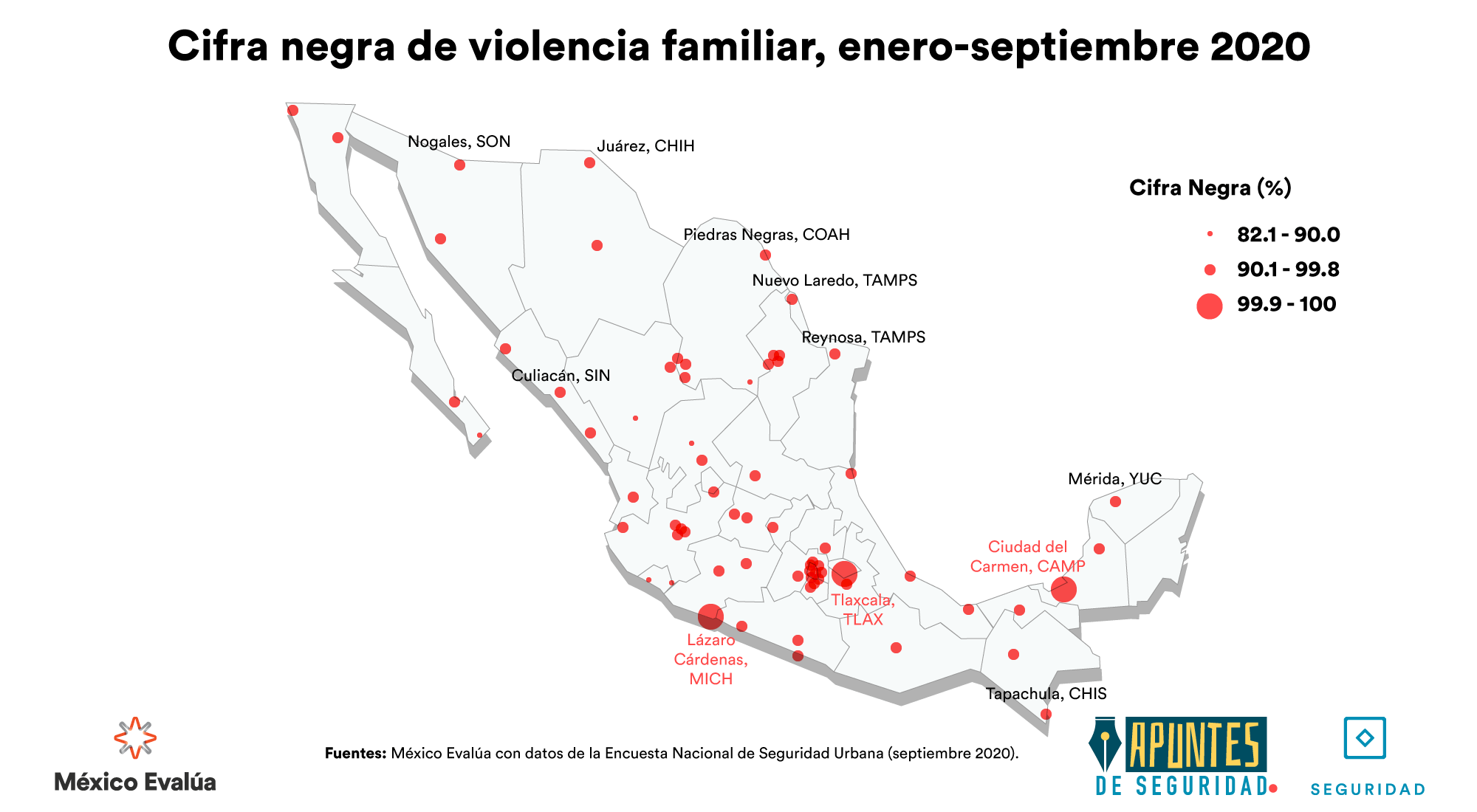 • Ciudad del Carmen, Campeche. La ENSU estima que 8,783 personas fueron víctimas de violencia familiar en lo que va de 2020. No obstante, sólo se abrieron tres carpetas de investigación por este delito durante el mismo periodo. Es decir, se registró una cifra negra de 100%.